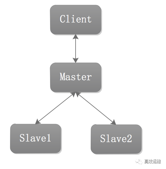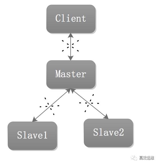 这是最常见的一种架构,一个Master节点,两个Slave节点。客户端写数据的时候是写Master节点,读的时候,是读取两个Slave,这样实现读的扩展,减轻了Master节点读负载。