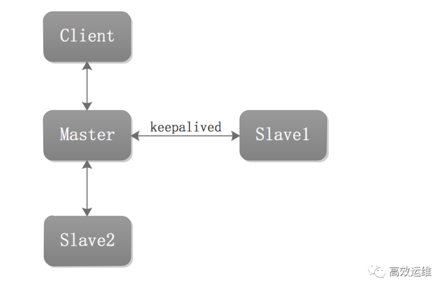 这种架构同样是一个Master和两个Slave。不同的是Master和Slave1使用keepalived进行VIP转移。Client连接Master的时候是通过VIP进行连接的。避免了方案一IP更改的情况。