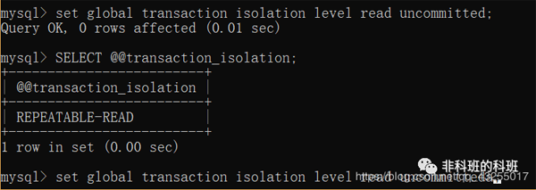 我: 他设置隔离级别的语句中set global transaction isolation level read uncommitted,这里的global也可以换成session,global表示全局的,而session表示当前会话,也就是当前窗口有效。