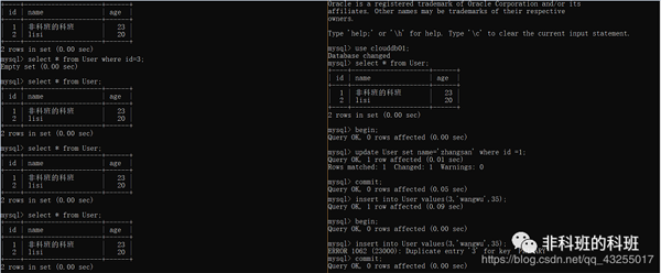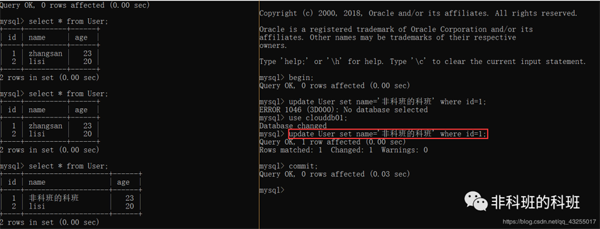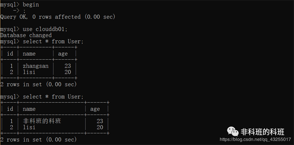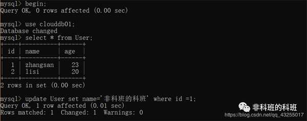 我: 这里直接打开两个新的窗口,同时开启事务,在第一个窗口先update一个id=1的数据行name改为'非科班的科班',执行成功。