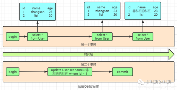 我: 这个是读提交的时间轴图,读未提交的时间轴图,原理也一样的,第二个select的时候数据就已经改变了。