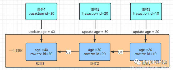 我: 如图中所示,假如三个事务更新了同一行数据,那么就会有对应的三个数据版本。