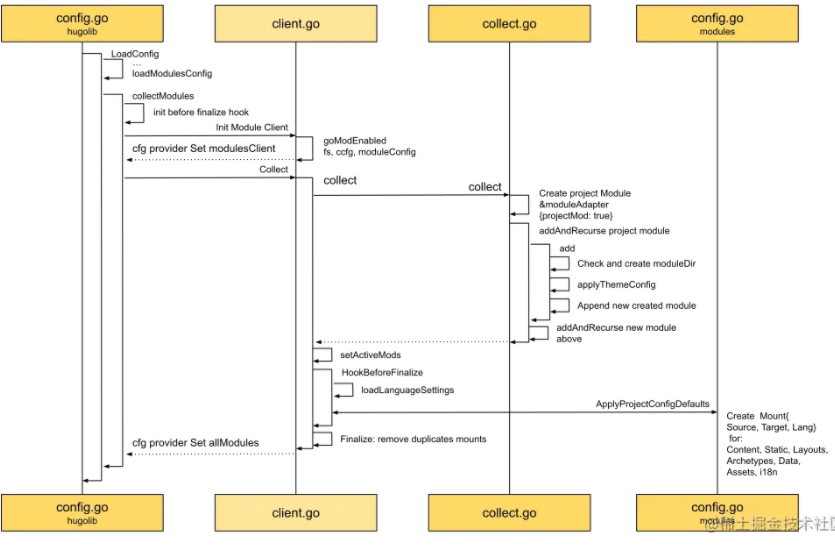 回调函数设置好后,接着就开始收集模块了。 如上图左上角所示,首先需要创建Module Client用来具体处理模块的收集工作。 为什么要叫Client呢? 这是因为现在Hugo支持Golang的mod模式,意味着可以用go.mod来导入主题,那我们就需要下载依赖包 - 主题工程来管理依赖了。 这样来看,叫客户端是不是就不难理解了。 在我们的示例中,主题目录是用来做流程讲解示范的,只有一个文本文件,所以这里的场景并不涉线上go模块加载。