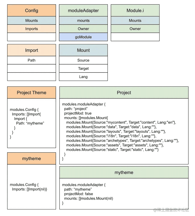 主题信息来源于用户自定义信息,作为输入传入收集模块功能单元。 在处理过程中,Hugo按Name, Module Config, Module, Mounts的对应关系,将模块相关信息进行处理。 最终生成所有模块的信息,并通过将这些信息设置在Config Provider中,为后续的操作做好准备。