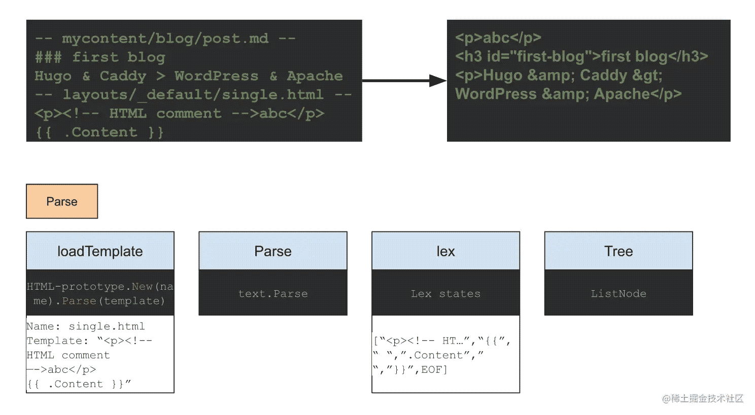 从上例中,我们可以看到,左上方是输入的信息。 包含一篇博客 - post.md,和一个模板 - single.html。 通过转换会得到最右边的输出网页内容。 其中,包含在模板中第一行的信息,剩下的是由博客提供的信息,其中的特殊字符,还被进行了转义。