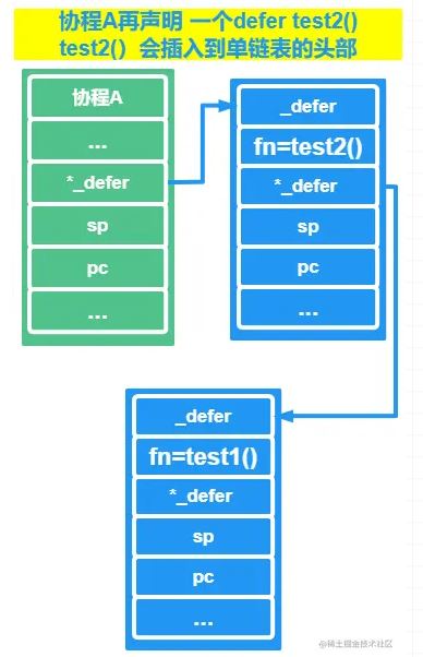 可以看出后声明的defer会插入到单链表的头,先声明的defer被排到后面去了