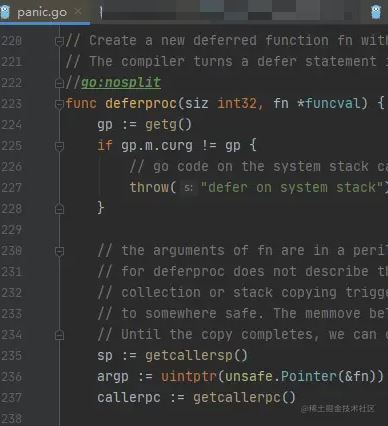 源码文件在 src/runtime/panic.go 中,查看 函数 deferproc