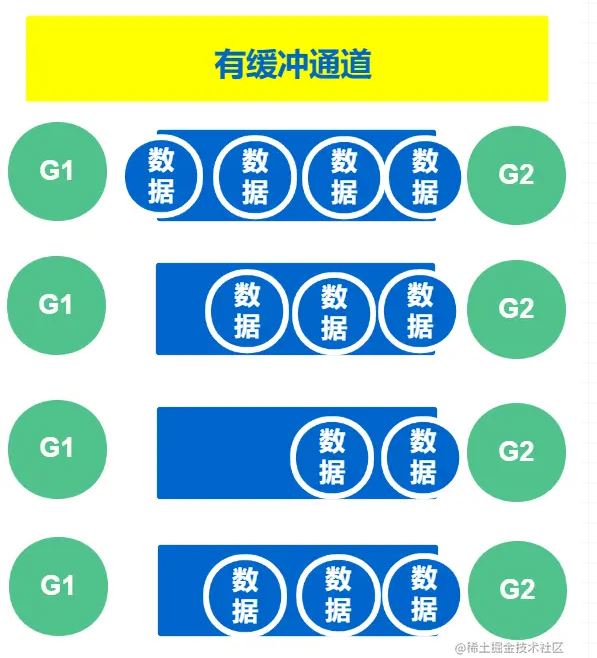 此时,该通道的容量为4,发送方可以一直向通道中发送数据,直到通道满,且通道数据未被读走时,发送方就会阻塞
