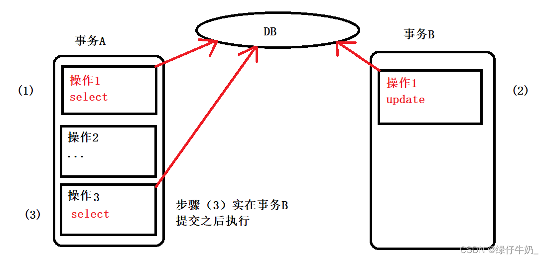 同样事务AB并发下操作数据库中同一数据,首先事务A对该数据进行查询,查询之后又进行了其他操作。与此同时,事务B执行了更新操作并且成功commit。那么当事务A再次对数据库查询的时候就会出现与上次读取到的数据不一致的情况