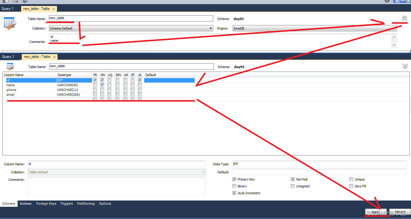 填写Table Name,Comments之后点击向上的箭头,填写Column信息。