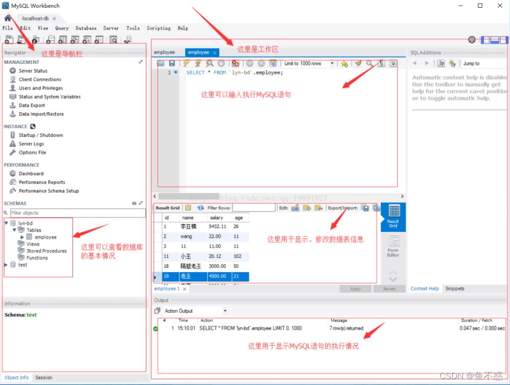 右侧为操作区,上部分可以书写MySQL语句,中部用于显示查询及修改数据表,下部用于显示MySQL语句的执行情况。