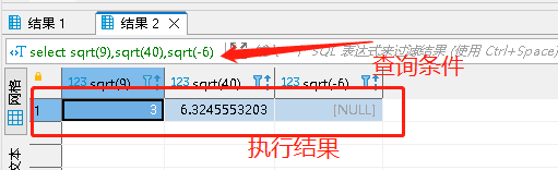 SQRT(x)返回非负数x的平方根。如果输入3的平方等于9,因此9的平方根为3;40的平方根为6.324555320336759;而负数没有平方根,因此-6返回的结果为NULL。