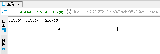 SIGN(x)返回参数的符号,x的值为负、零或正时返回结果依次为-1、0或1,比如输入:SIGN(-4)返回-1;SIGN(0)返回0;SIGN(4)返回1。