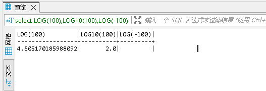 10的2次方等于100,因此LOG10(100)返回结果为2;LOG10(-100)定义域非负,因此返回NULL。