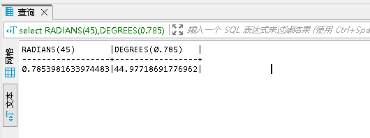 RADIANS(x)将参数x由角度转化为弧度。DEGREES(x)将参数x由弧度转化为角度。