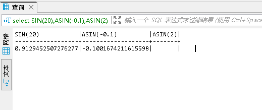SIN(x)返回x的正弦值,其中x为弧度值。ASIN(x)返回x的反正弦值,即正弦为x的值。若x不在-1~1的范围之内,则返回NULL。