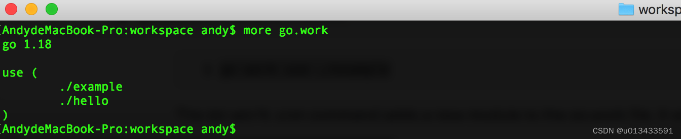 初始化工作空间 - 在workspace目录下 执行以下命令,该命令会自动生成一个go.work 文件