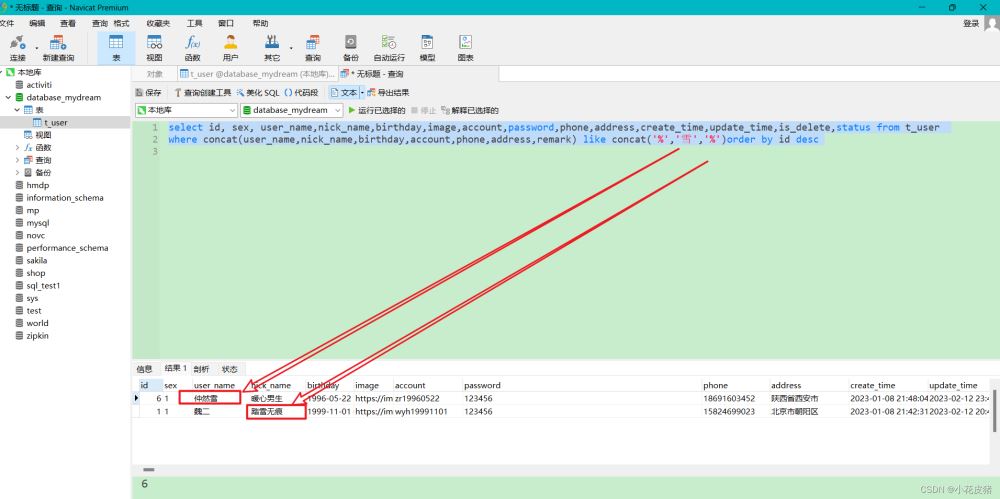 where concat(user_name,nick_name,birthday,account,phone,address,remark) like concat('%','雪','%')order by id desc