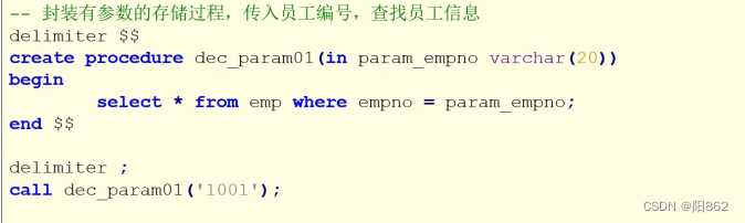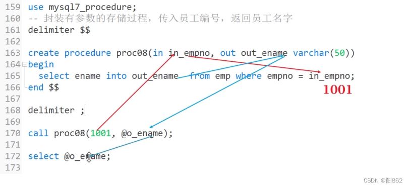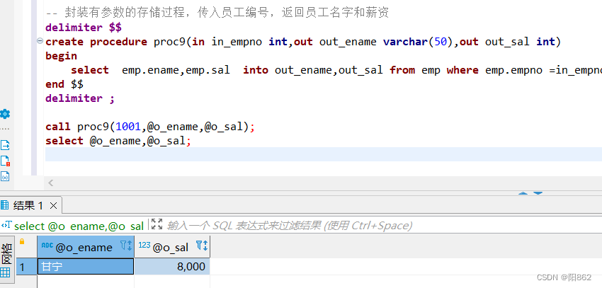 -- 封装有参数的存储过程,传入员工编号,返回员工名字和薪资 delimiter $$ create procedure proc9(in in_empno int,out out_ename varchar(50),out out_sal int) begin select emp.ename,emp.sal into out_ename,out_sal from emp where emp.empno =in_empno; end $$ delimiter ; call proc9(1001,@o_ename,@o_sal); select @o_ename,@o_sal;