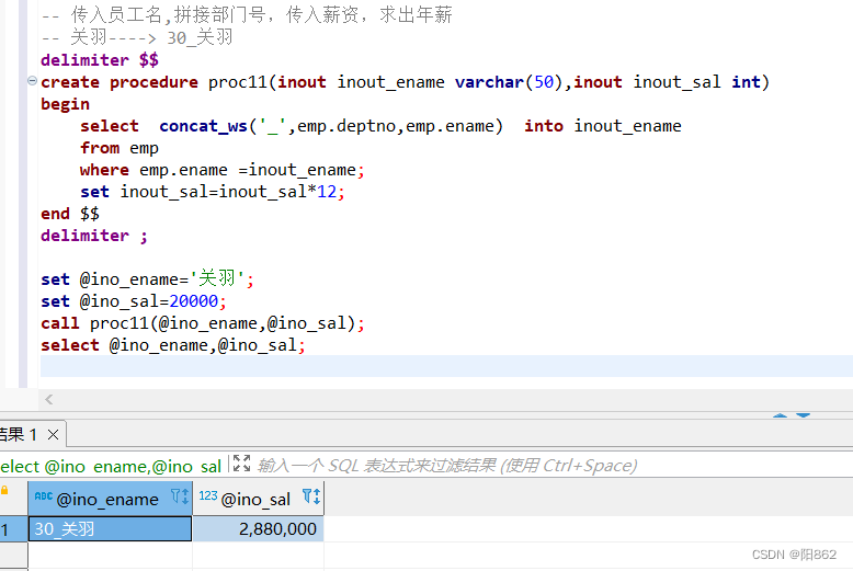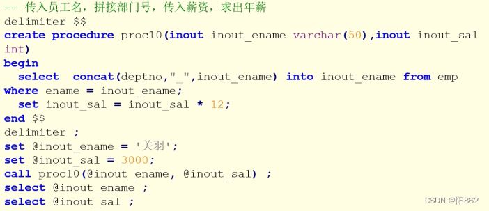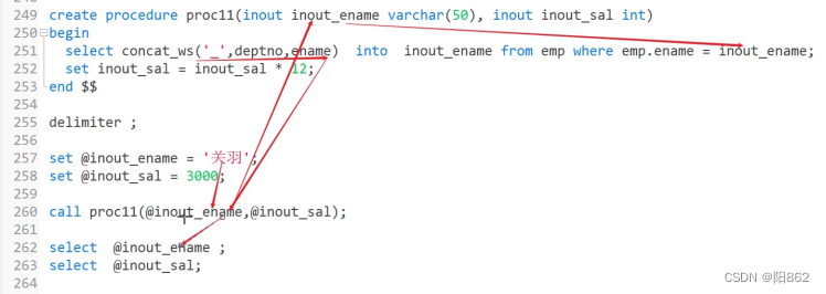 create procedure proc11(inout inout_ename varchar(50),inout inout_sal int)