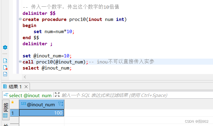 -- 传入一个数字,传出这个数字的10倍值 delimiter $$ create procedure proc10(inout num int) begin set num=num*10; end $$ delimiter ; set @inout_num=10; call proc10(@inout_num);-- inou不可以直接传入实参 select @inout_num;