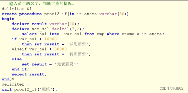 delimiter $$ create procedure proc12(in in_score int) begin if in_score <pre class="brush:sql;">-- 输入员工的名字,判断工资的情况。 /* sal = 10000 and sal = 20000 :元老薪资 */ delimiter $$ create procedure proc13(in in_ename varchar(50)) begin declare de_sal decimal(7,2); declare de_result varchar(50); select emp.sal into de_sal from emp where emp.ename =in_ename; if de_sal <h2> 五.流程控制—case</h2> <p>CASE是另一个条件判断的语句,类似于编程语言中的switch语法</p> <h3>语法</h3> <p style="text-align:center"><img alt="" style="max-width:100%" src="/uploads/20230225/167728867663f964e4b95db.png" style="max-width:100%"></p> <p> 演示</p> <pre class="brush:sql;">/* 支付方式: 1 微信支付 2 支付宝支付 3 银行卡支付 4 其他方式支付 */ -- 格式一 delimiter $$ create procedure proc16(in in_type int) begin case in_type when 1 then select '微信支付'; when 2 then select '支付宝支付'; when 3 then select '银行卡支付'; when 4 then select '其他方式支付'; end case; end $$ delimiter ; call proc16(2); -- 格式二 delimiter $$ create procedure proc17(in in_type int) begin case when in_type=1 then select '微信支付'; when in_type=2 then select '支付宝支付'; when in_type=3 then select '银行卡支付'; when in_type=4 then select '其他方式支付'; end case; end $$ delimiter ; call proc17(4);