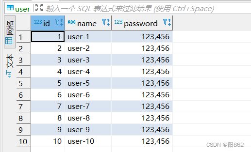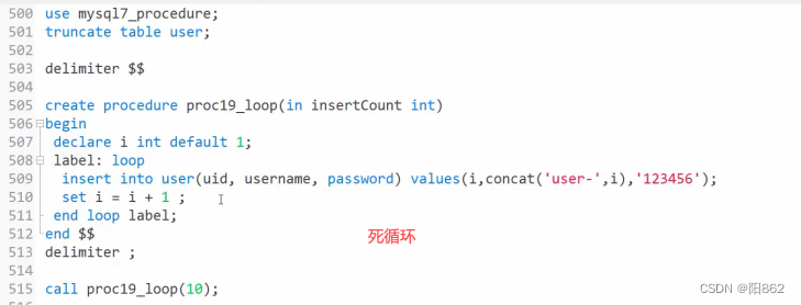 insert into user(id,name,password) values(i,concat('user-',i),123456);