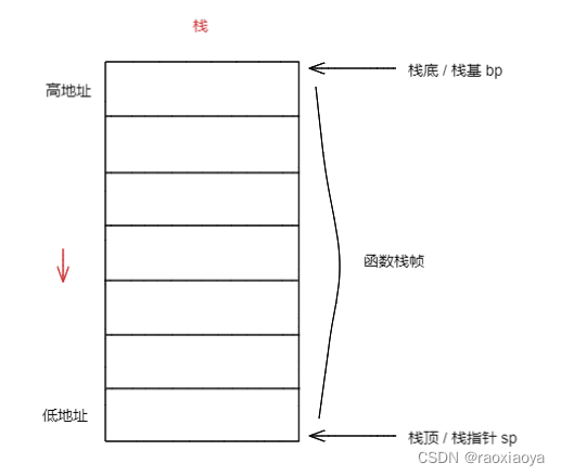 函数执行时需要有足够的内存空间用来存储参数,局部变量,返回值,这块空间对应的就是栈,栈区是从高地址向低地址生长的,且先进后出。分配给函数的栈空间被称为函数栈帧。