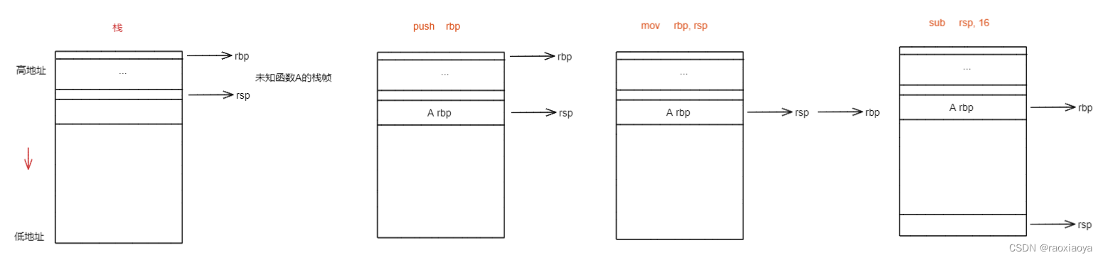 // 此时rbp存储的还是上一层函数(调用者)的栈基地址,将rbp的值入栈保存起来,因为main函数也是被其他函 // 数调用的,运行完main之后还得回到那个函数体中去。这里的地址指的是指令的地址,是代码段中的位置。 // push指令会使rsp下移。 push rbp // 此时rbp存储的还是上一个函数的基地址,而rsp则已经游走到了main函数这里,mov指令将rsp中存储的地址传递 // 给rbp,也就意味着执行完之后rbp和rsp都处于main函数的开始位置,称为初始化操作。 mov rbp, rsp // rsp下移16,就是分配栈空间 sub rsp, 16