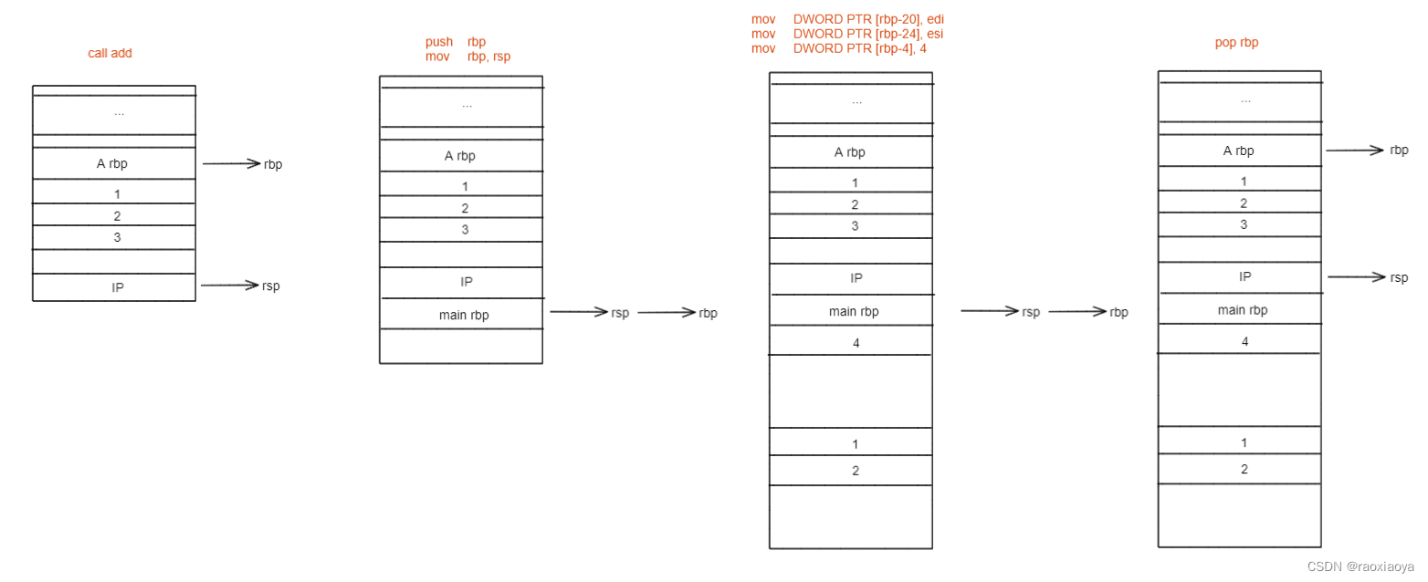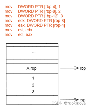 // DWORD 为双字,即四个字节,PTR为指针的意思,此句意为在rbp向下偏移4个字节的这段栈内存中存储0 // a mov DWORD PTR [rbp-4], 1 // b mov DWORD PTR [rbp-8], 2 // sum mov DWORD PTR [rbp-12], 3 // 将参数从右到左,依次存起来,此处存到了 edx和eax,并拷贝了一份到esi和edi。 mov edx, DWORD PTR [rbp-8]` mov eax, DWORD PTR [rbp-4]` mov esi, edx` mov edi, eax`