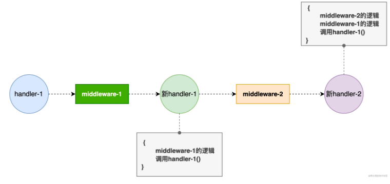 }这里的h是注册路由时指定的请求处理器。middelware就是使用Use函数注册的所有的中间件。这里实际上循环对h进行层层包装。 索引i从middleware切片的最后一个元素开始执行,这样就实现了先试用Use函数注册的中间件先执行。