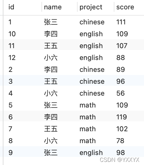 +--------+---------+------+---------+ | name | chinese | math | english | +--------+---------+------+---------+ | 小六 | 56 | 78 | 88 | | 张三 | 111 | 109 | 98 | | 李四 | 89 | 119 | 109 | | 王五 | 96 | 102 | 107 | +--------+---------+------+---------+