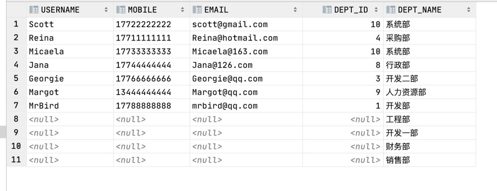 如下图 与左外连接刚好相反 查询出了所有部门信息,不符合条件的用户信息字段都为NULL