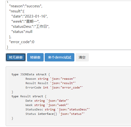 这里我们利用下json转golang struct的小工具,把接口返回的json转成golang的代码