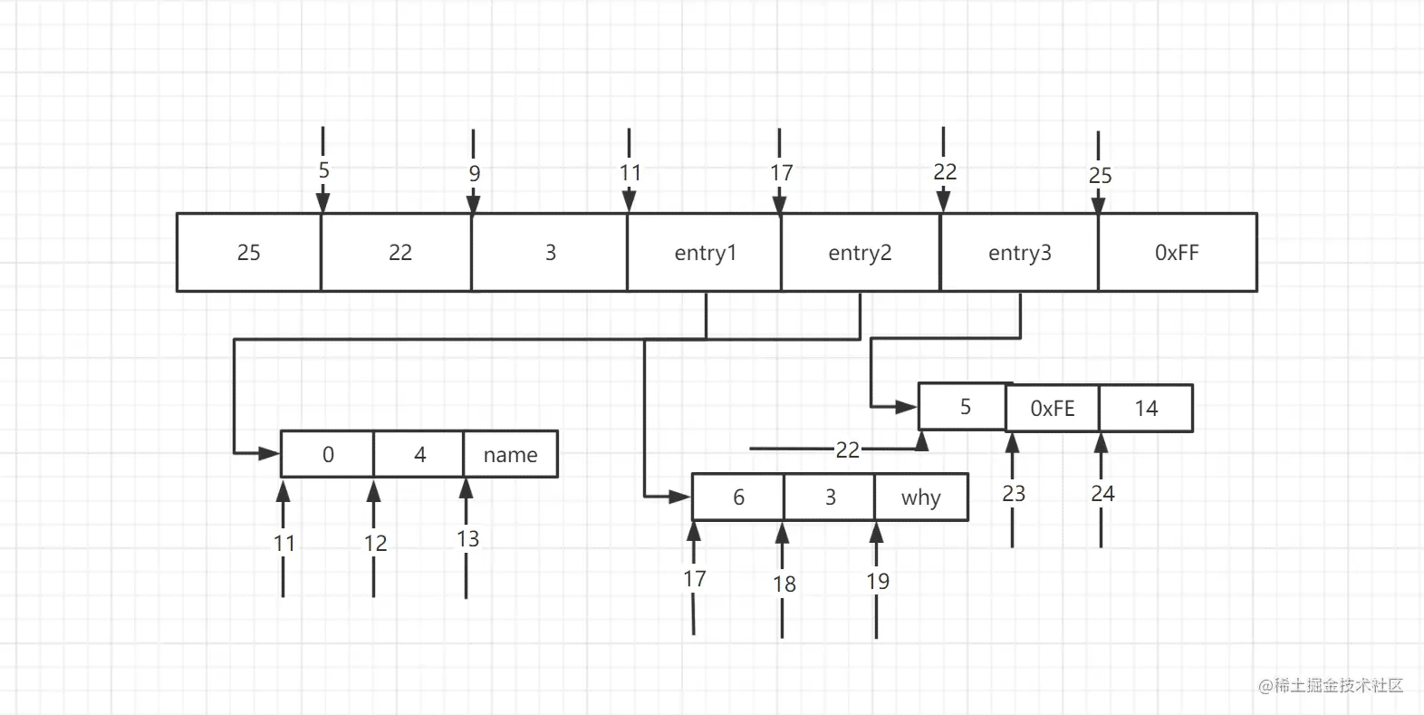 - 第22-24字节,第三个entry: 其中prevlen=5,表示前一个entry共占用5byte;encoding=0xFE,表示后面1byte存储整数,数据的值为14