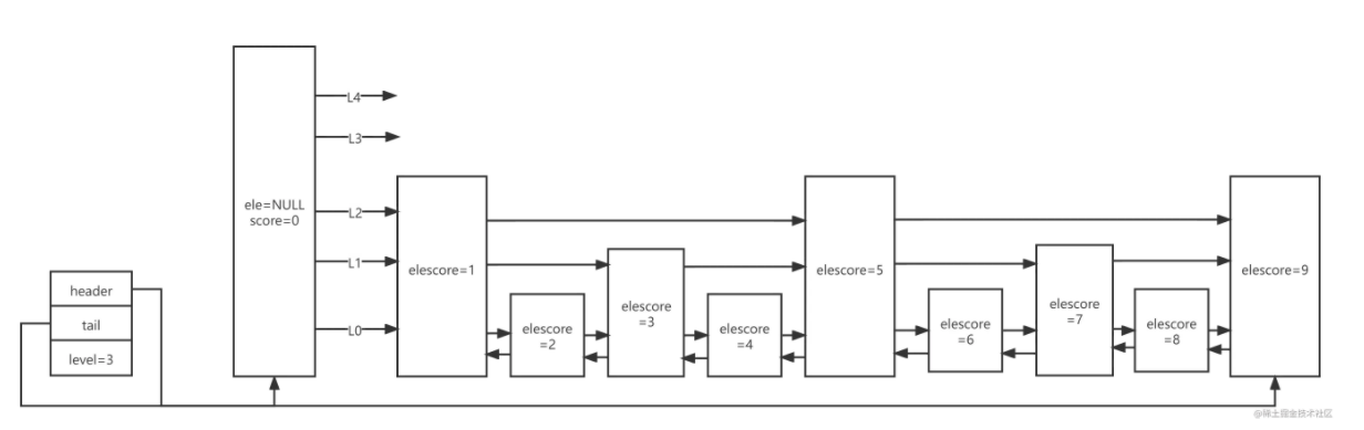 | span | 跨度,存储一个节点跳到下一个节点中间跳过了多少节点 | 如score1指向score5,则span值为4,这是排名的实现原理 |