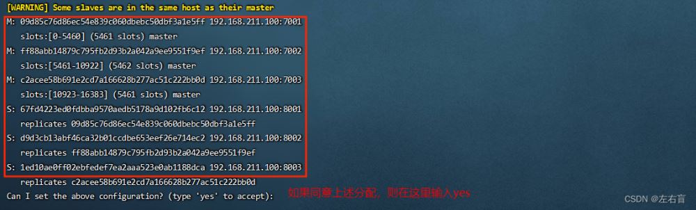 执行上述命令之后,控制台会列出当前主从节点分配的结果,即将那些slave分别分配给哪些master,并询问你是否同意,这里我们输入'yes'即可