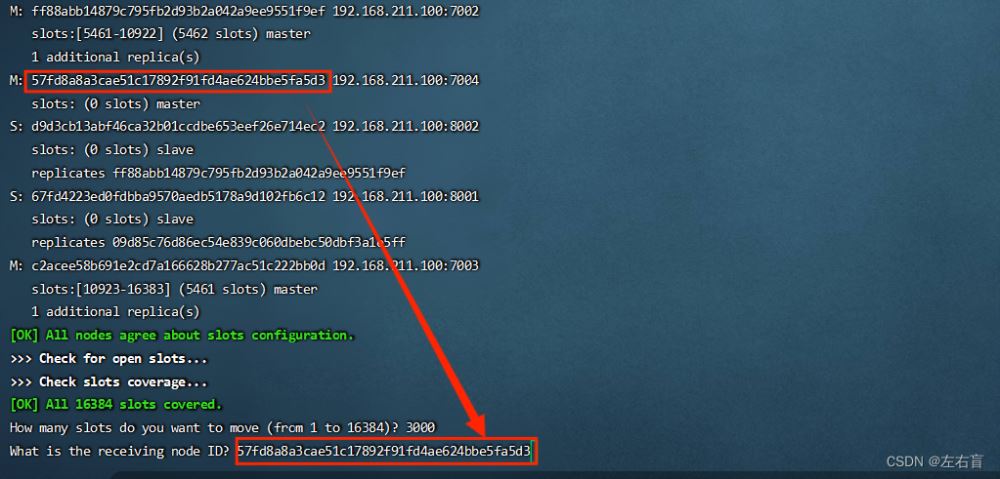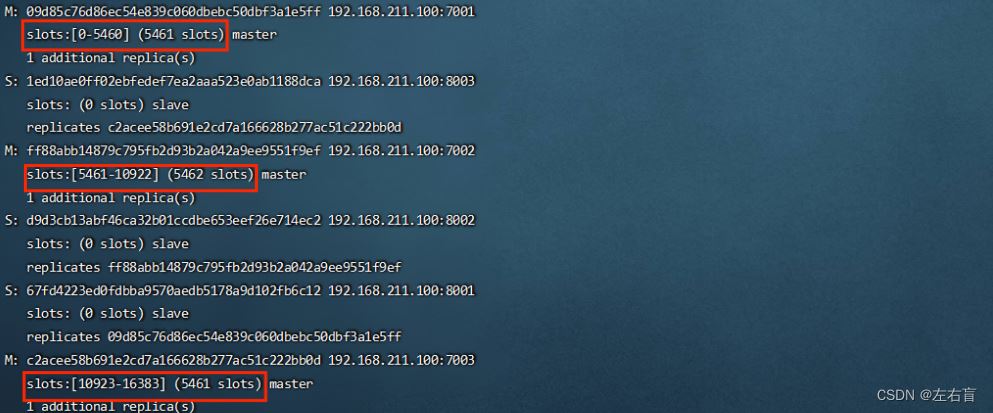 一个Redis分片集群有0~16383共16384个插槽(hash slot),这些插槽会被平均分给每一个master节点,一个master节点映射着一部分插槽,这一点在集群创建时的信息中可以看到