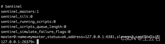 使用./src/resic-cli -p 26379 命令连接sentinel(其他两个也可以使用这个连接),成功后,使用info命令,可以看到监听的redis集群状态