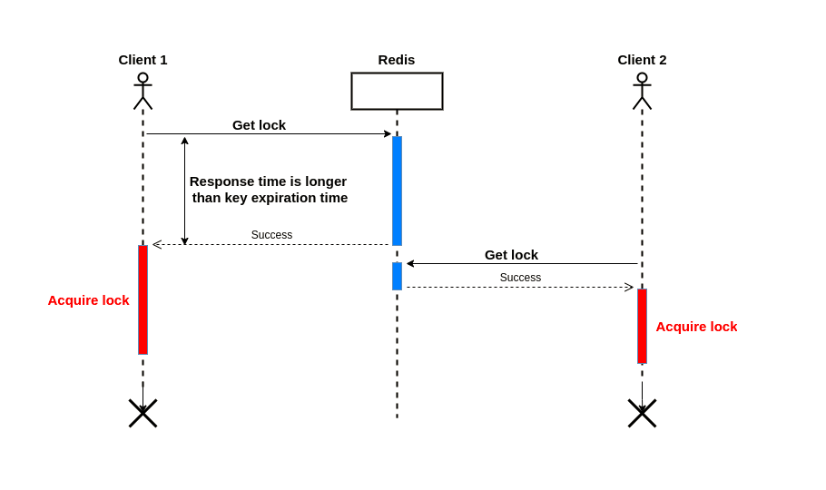 **假如客户端1请求服务端获取一个锁,并指定了锁超时时间,如果服务器响应的时间大于锁的超时时间,客户端1拿到的则是一个过期的锁,这时客户端2同时可以获取该锁进行业务操作。**这打破了分布式锁应该具备的相互排斥原则。