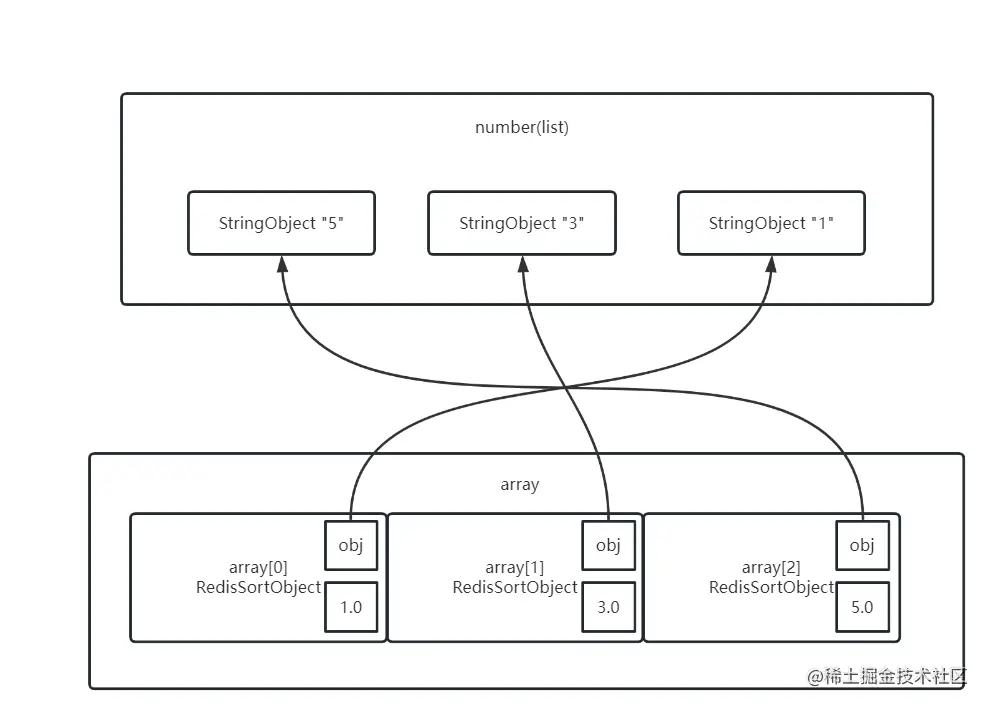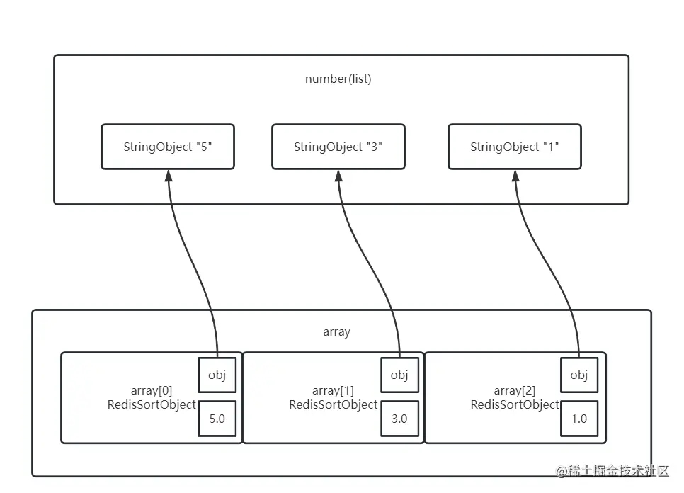 Sort命令会使用一个与原来对象等长的数组,数组中的节点RedisSortObject存储了元素(指向对应元素)以及权值,排序就是根据权值来排序,权值默认情况下是浮点型,如果要排序的是字符串则权值为字符串对象