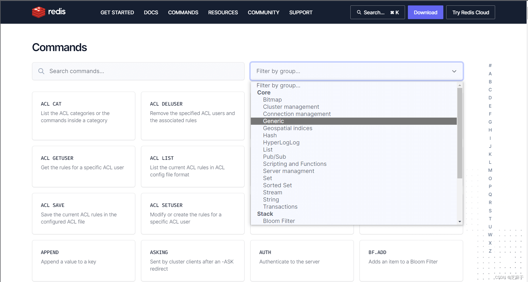 Redis为了方便我们学习,将操作不同数据类型的命令也做了分组,在官网( Commands | Redis)可以查看到不同的命令:(点击COMMANDS)