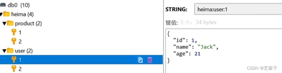 | heima:user:1 | {"id":1, "name": "Jack", "age": 21} |