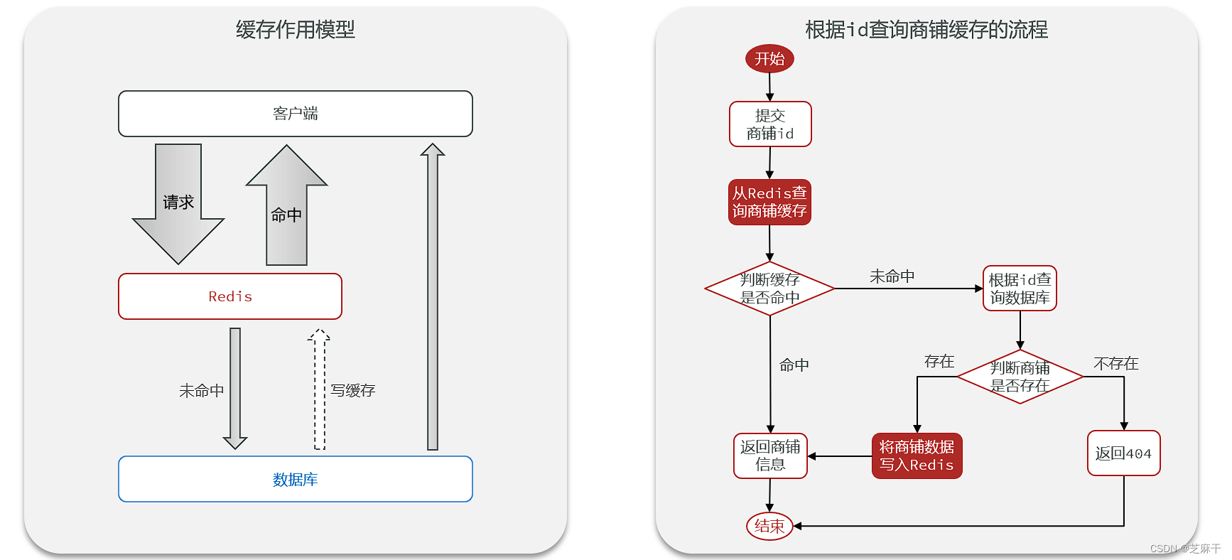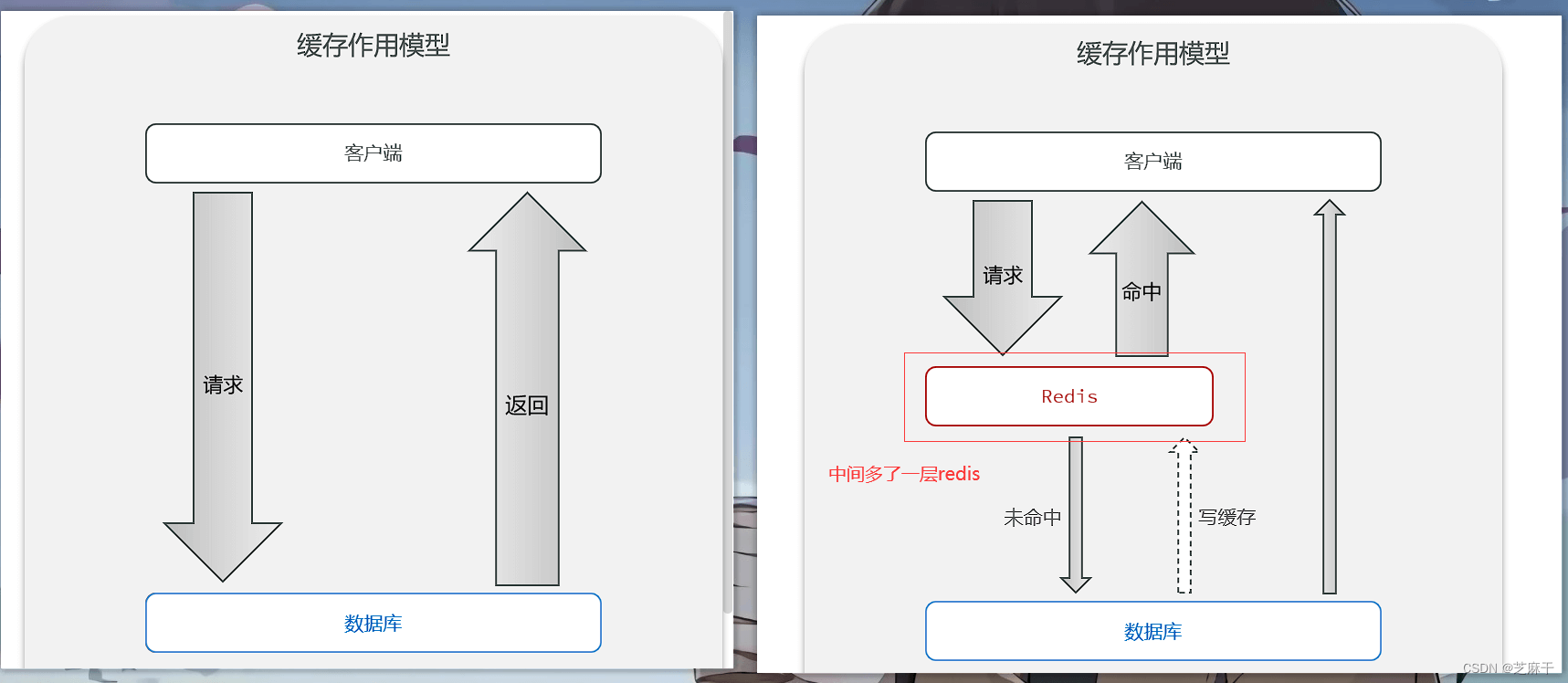 原本的模型应该是客户端发送请求给数据库,数据库返回数据给客户端,而Reids的缓存模型就是在原有的基础上,在中间加上一层Redis(经典的中间件思想~)用户每次都会先去redis中查找数据,如果未命中才会去数据库中查找数据,并写入Reis当中,这么一来,用于下次需要相同的数据的时候,就可以在Reis当中进行获取,又因为Redis的高读写效率,实现了缓存的效果~