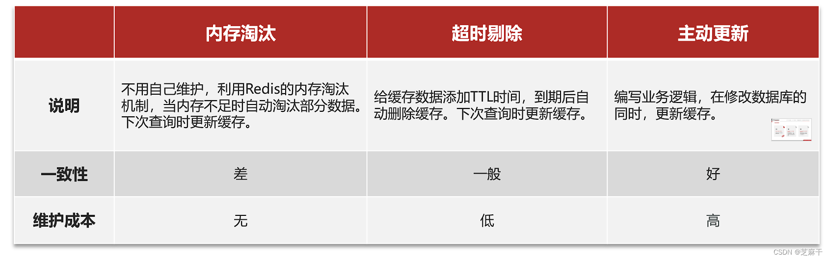 1. 内存淘汰策略:这种策略没有维护成本,这是利用Redis的内存淘汰机制,当内存不足的时候自动淘汰,下次请求时再继续存入数据。