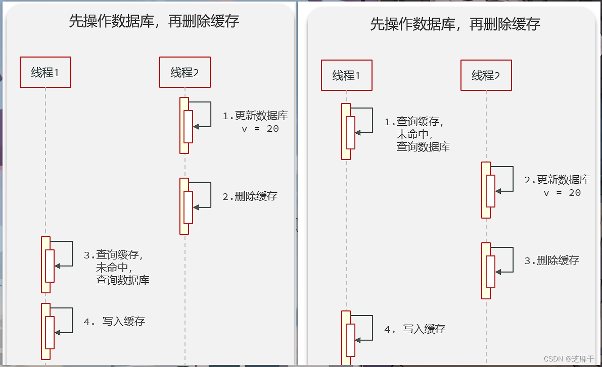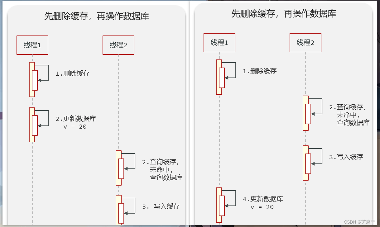 第一种情况,先删除缓存的情况,我们想的正常的不会出现问题的操作流程(左边)和操作会出现问题的流程(右边)