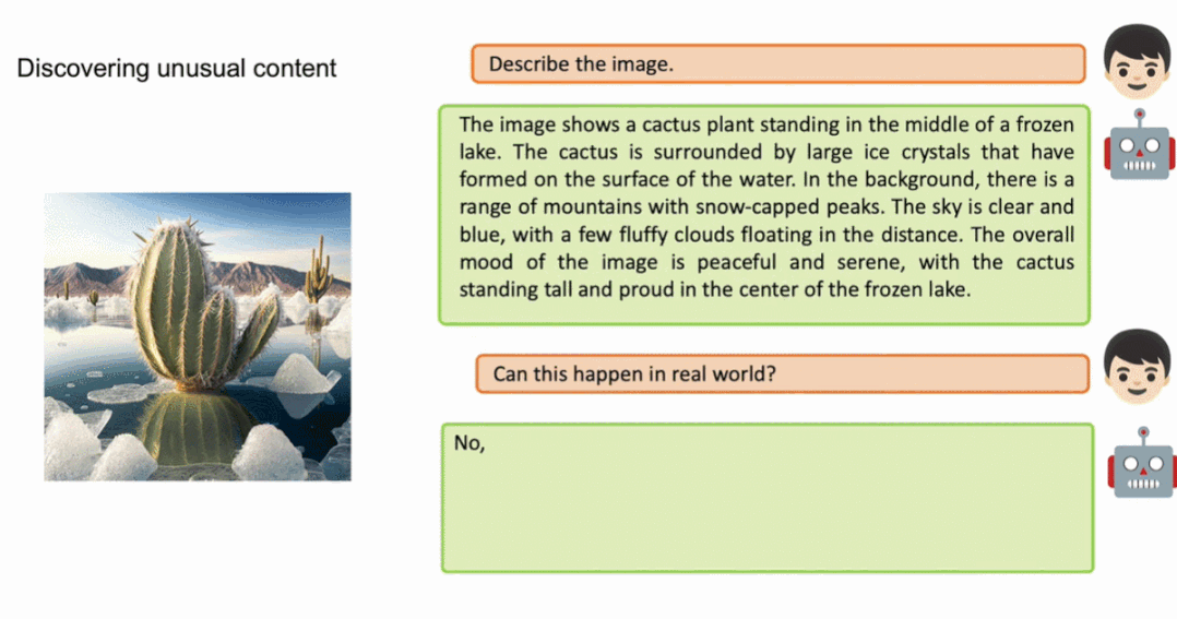 首先考察一下 MiniGPT-4 对图片的描述能力。对于左边的图,MiniGPT-4 给出的回答大致为「图片描述的是生长在冰冻湖上的一株仙人掌。仙人掌周围有巨大的冰晶,远处还有白雪皑皑的山峰……」假如你接着询问这种景象能够发生在现实世界中吗?MiniGPT-4 给出的回答是这张图像在现实世界并不常见,并给出了原因。