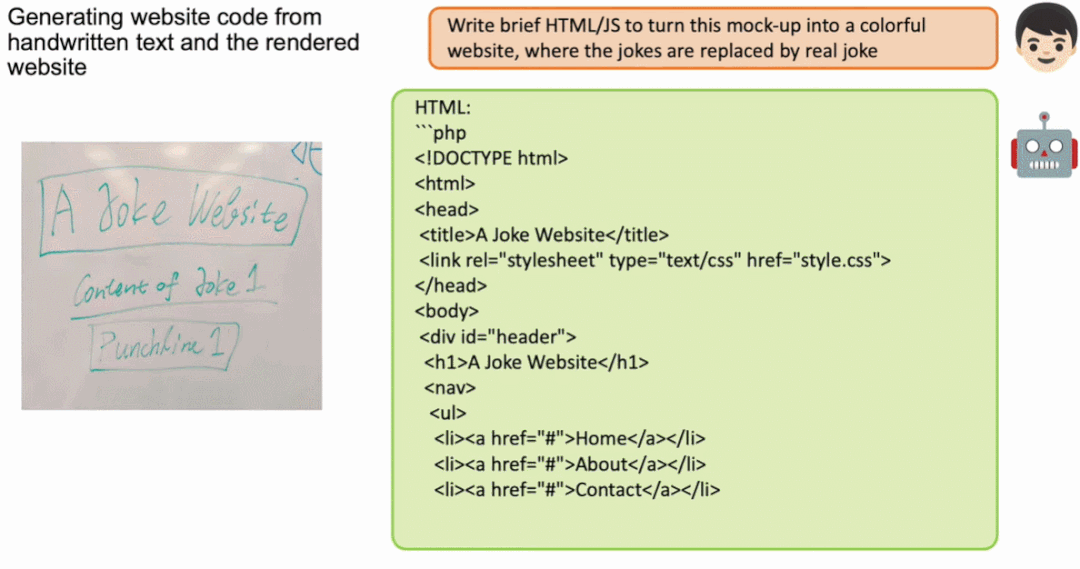 其实 GPT-4 的魅力远不及此,更炸场的是利用手绘草图直接生成网站,在草稿纸上画一个潦草的示意图,拍张照片,然后发给 GPT-4,让它按照示意图写网站代码,嗖嗖的,GPT-4 就把网页代码写出来了。