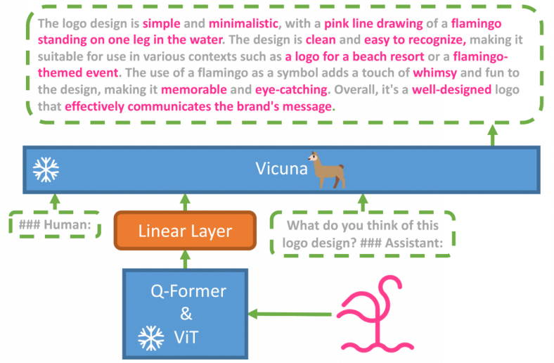 MiniGPT-4 由一个预训练的 ViT 和 Q-Former 视觉编码器、一个单独的线性投影层和一个先进的 Vicuna 大型语言模型组成。MiniGPT-4 只需要训练线性层,用来将视觉特征与 Vicuna 对齐。