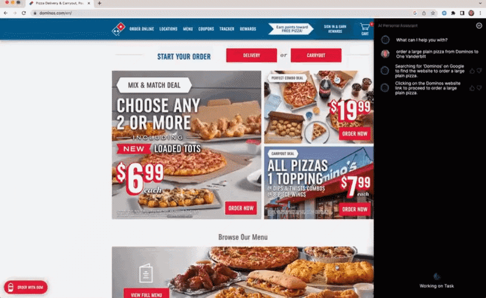 请看一下这个刚刚从 HyperWrite 发布的自主智能体,你可以看到它被安装在了浏览器中,可帮助人们订购比萨。